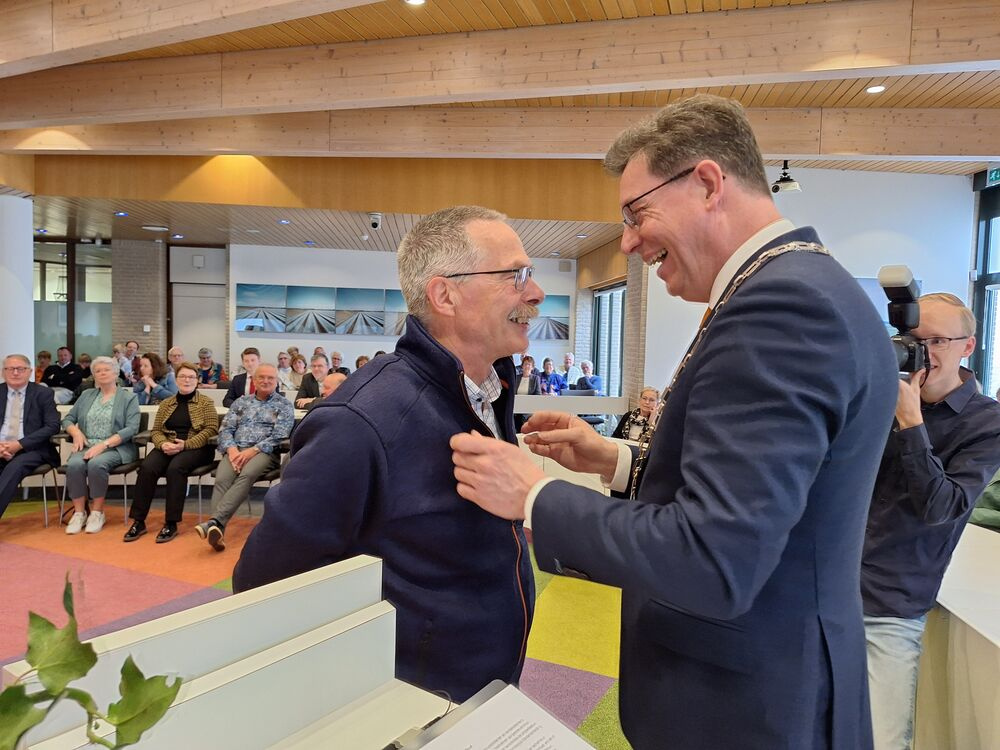 Vandaag, 30 oktober, heeft burgemeester Roger de Groot de Koninklijke onderscheiding Lid in de Orde van Oranje Nassau aan Piet Koster uitgereikt. Het gebeurde juist op deze dag bij het afscheid van Piet als voorzitter van de ouderensoos JVV. Tegelijkertijd was het ook de laatste vergadering van de JVV.