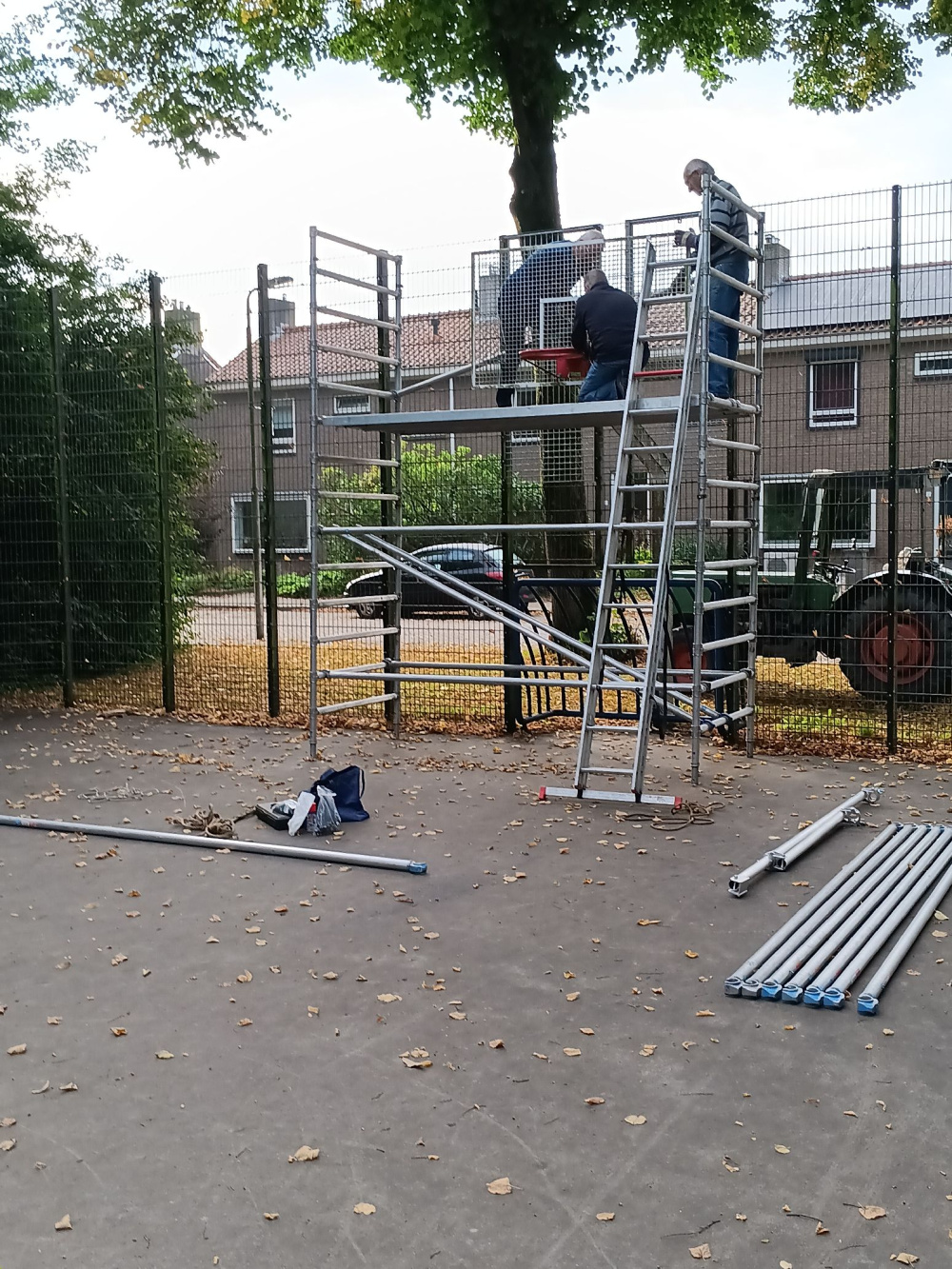 Dorpsbelang heeft in de laatste week van de zomervakantie enkele roosters van het hekwerk vernieuwd. De roosters waren deels kapot, helaas door vandalisme. Het vervangen van deze roosters was nog een hele klus, omdat ze achter de basketbalborden zitten. Daardoor eerst deze borden demonteren, nieuwe roosters plaatsen en dan de basketbalborden weer in oude staat terugbrengen. De foto laat deze werkzaamheden zien.